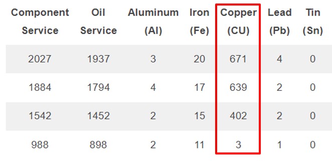 As it relates to high copper, you can differentiate between leached copper, normal brass bushing wear and abnormal bearing wear.