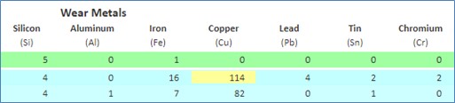 Below is a snapshot of the routine oil analysis report for a CAT C32diesel engine with less than 1,200 hrs of service with one previous oil change.  Initial review would likely suggest copper leeching with insignificant levels of “break-in” wear.