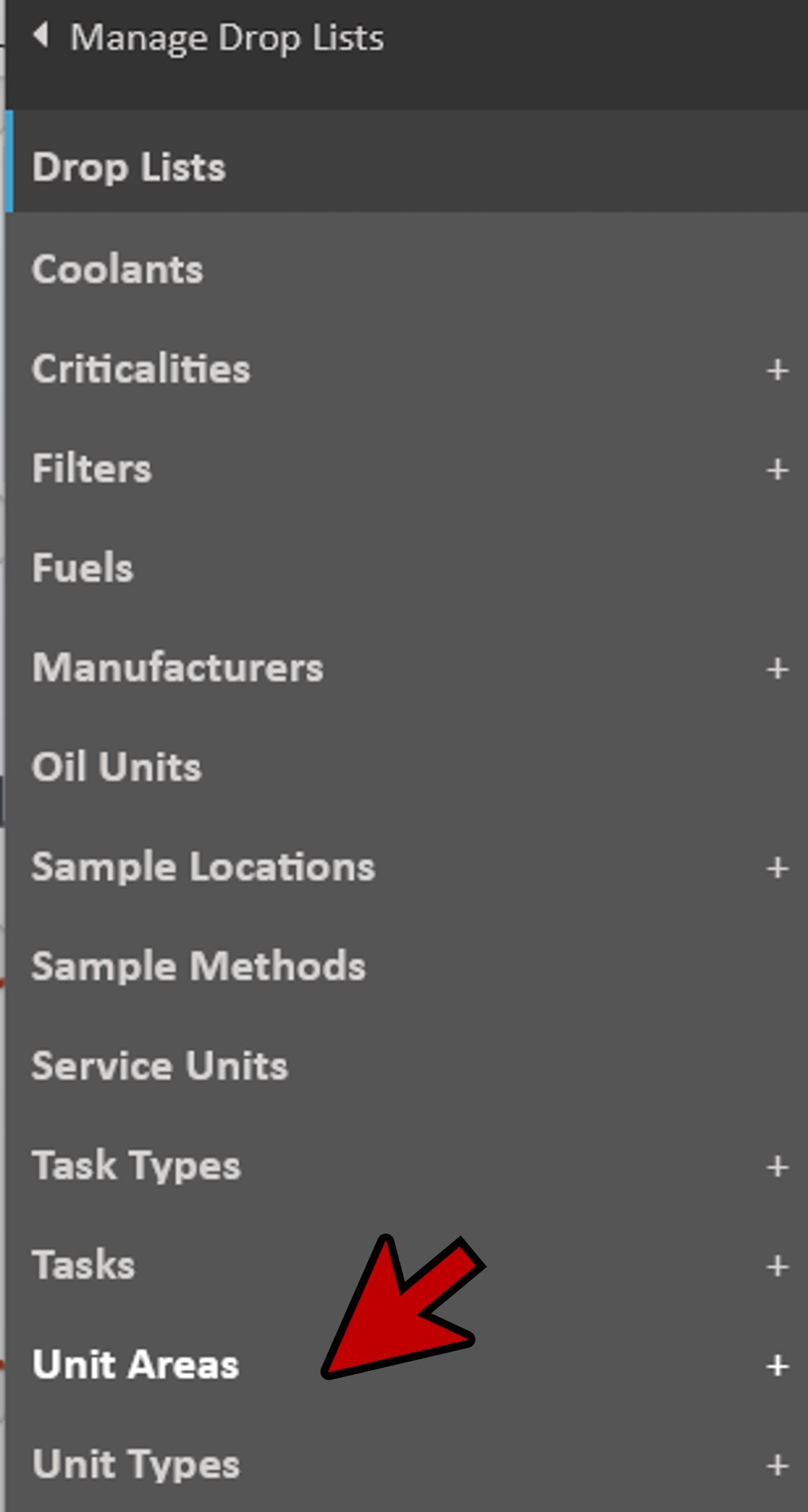 - On the drop list menu, select the list you would like to customize. As noted, the only drop lists you can add custom entries to are those with a “+” sign. For this example we are clicking on “Unit Areas”.