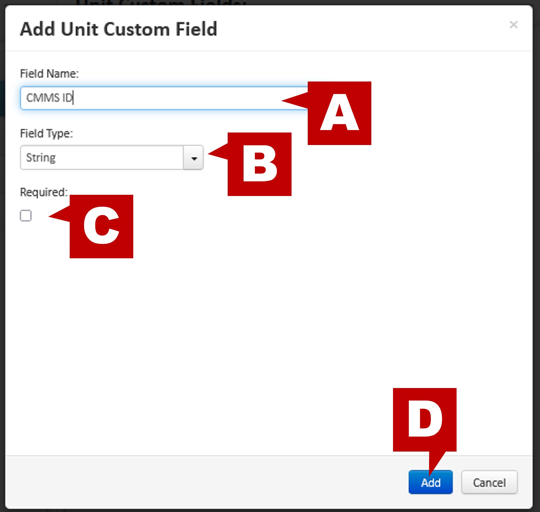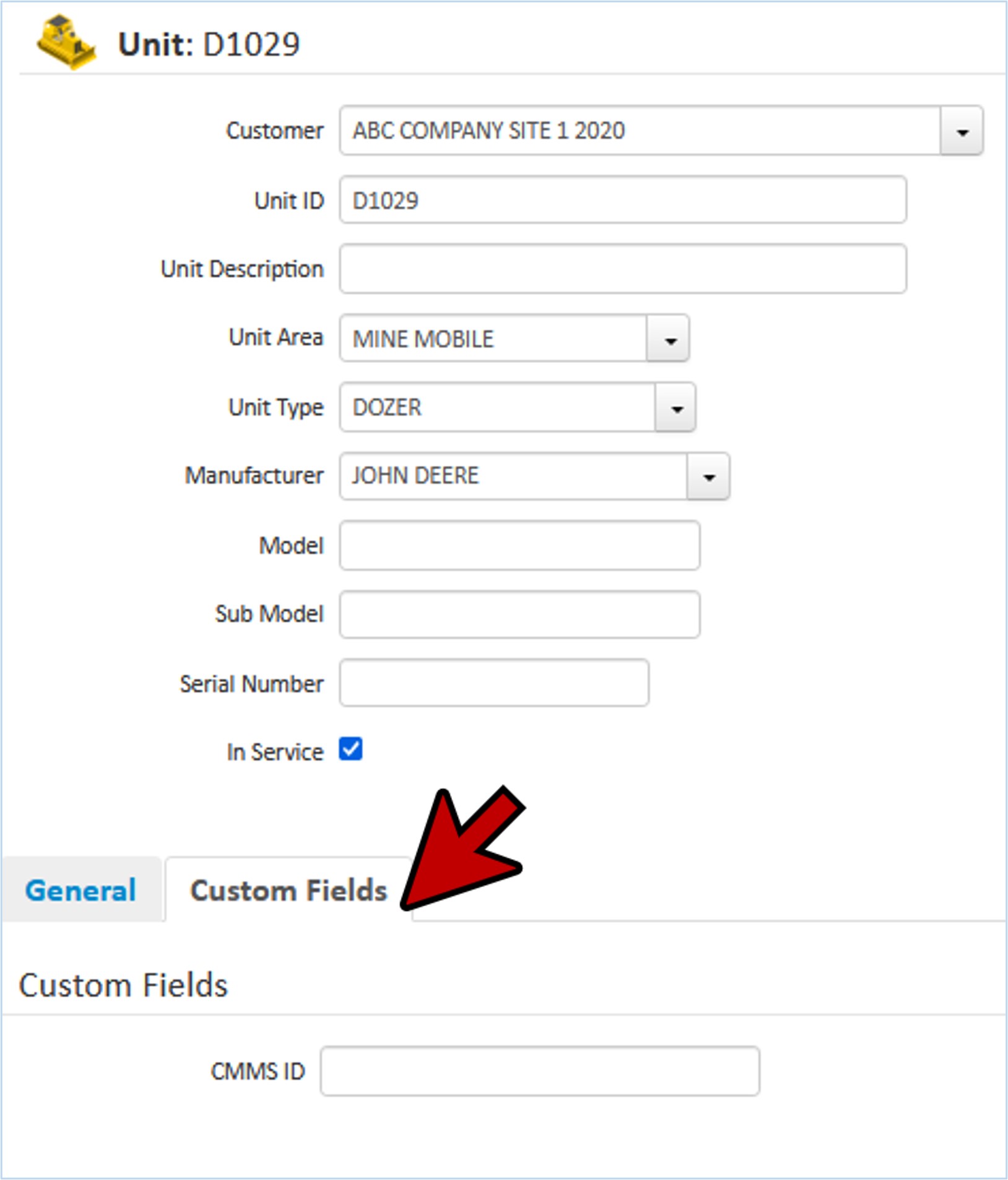 - In this example, the new custom field would be found under the Unit information for Equipment. The user would find the new field within the Unit information screen under the “Custom Fields” tab.