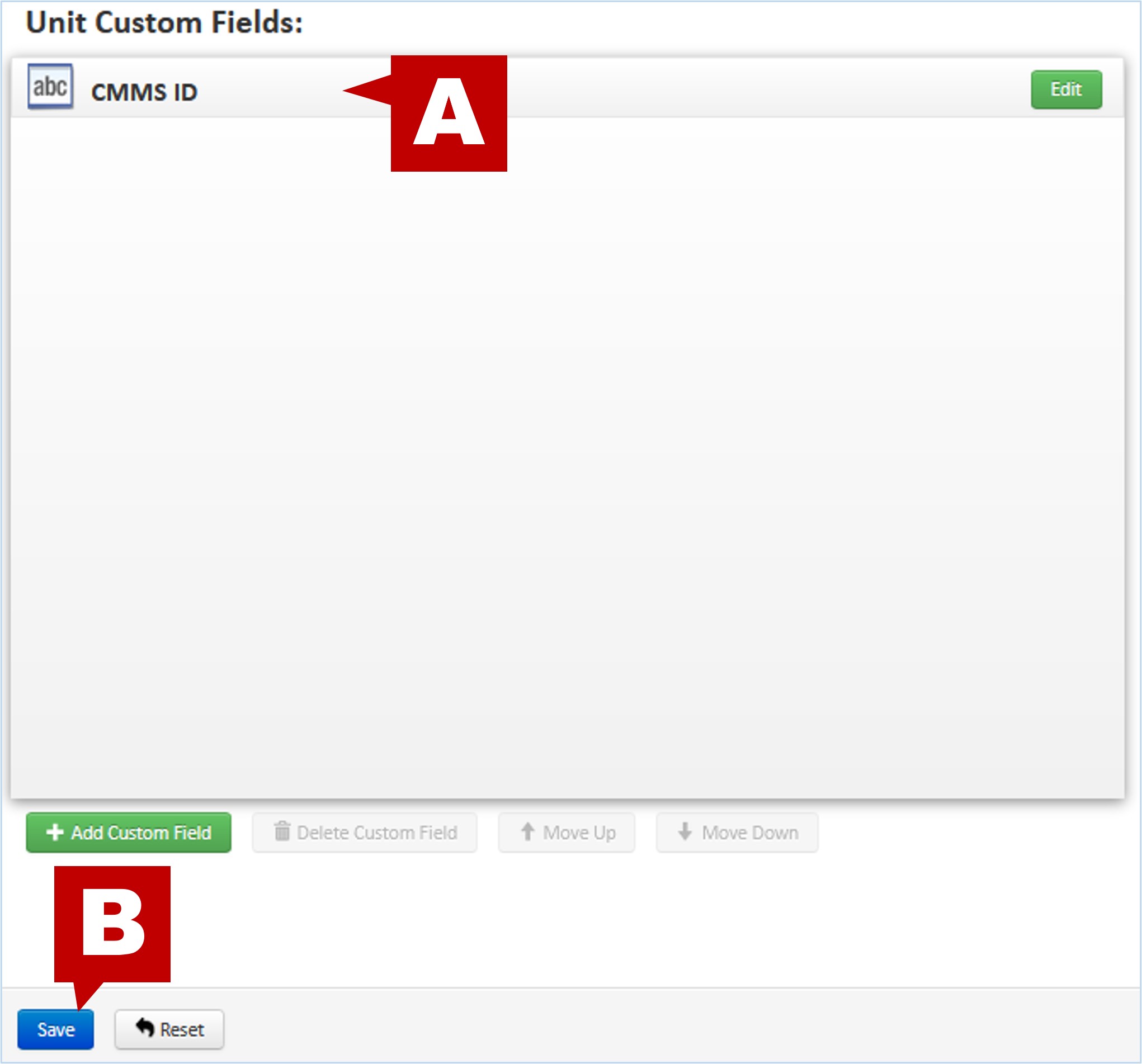 - The new field now appears in the custom field list (A). Click “Save” to save your changes (B).