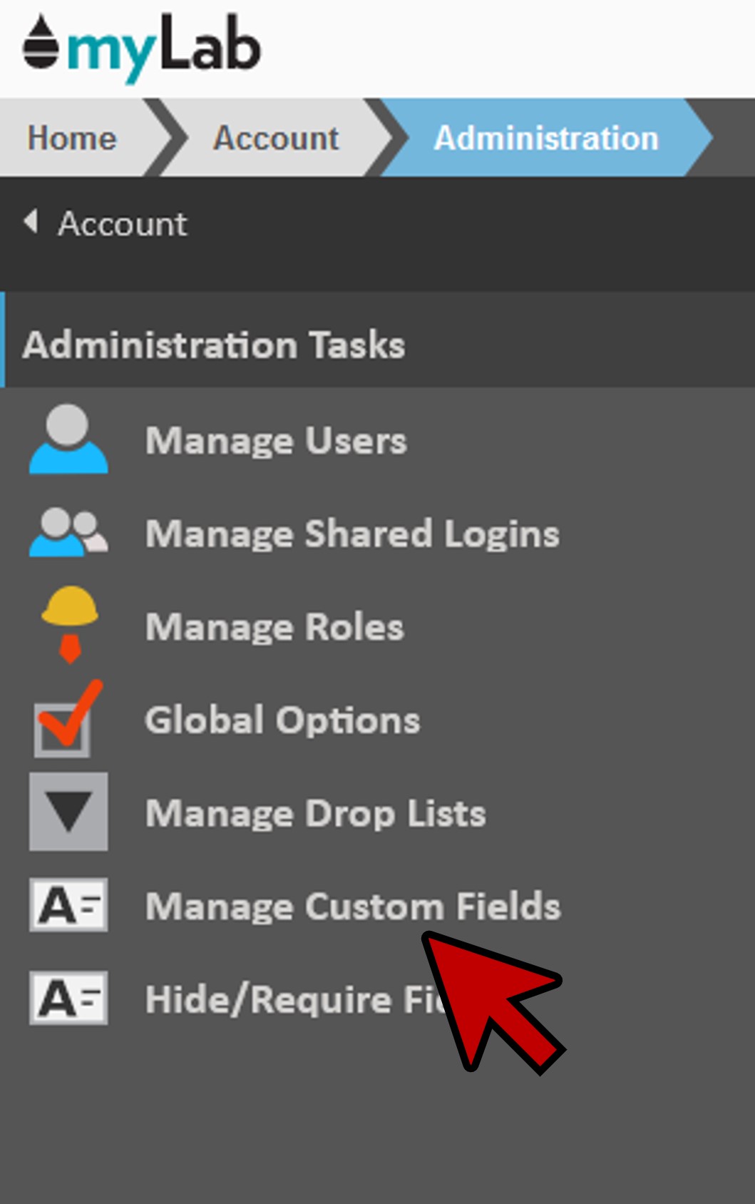 If you do not have an Administration icon in your “Tasks” drop down or in your Account tab, you do not have permissions to access this element. For each myLab site there is one Master User that always has this permission, and they can assign it to additional users.