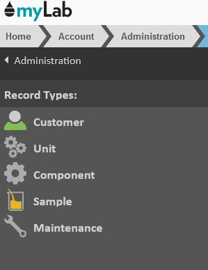 - The available record types of Customer, Unit, Component, Sample, and Maintenance (right image) allow for users to include additional or custom fields for identification or tracking purposes.