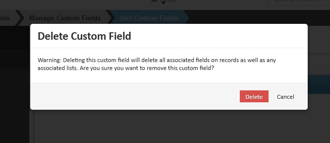 - A pop up will appear with a warning regarding the deletion of this field. Before deleting any field, make sure it will not adversely affect your database records.