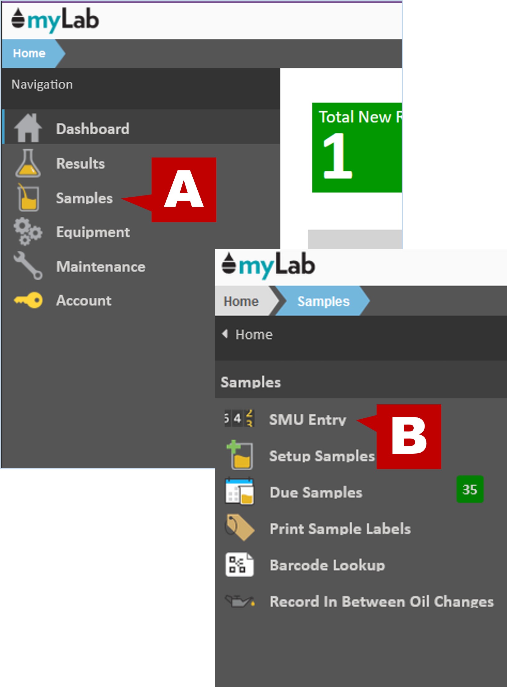 • From the Home screen, select “Register Samples” (A) and then “SMU Entry” (B) from the left menu.