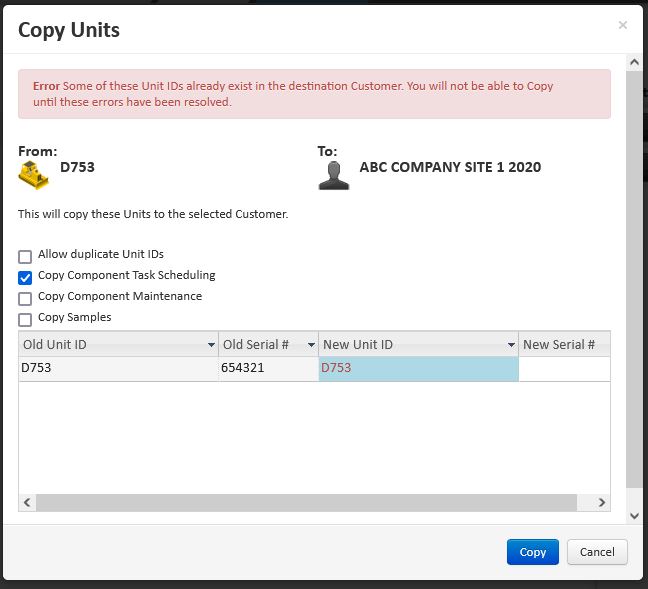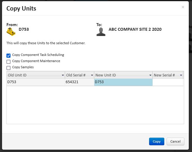 - If the unit does not already exist with in the customer record, the copy window will open and you can select the options to include in the copy to the new unit. Click “Copy”.