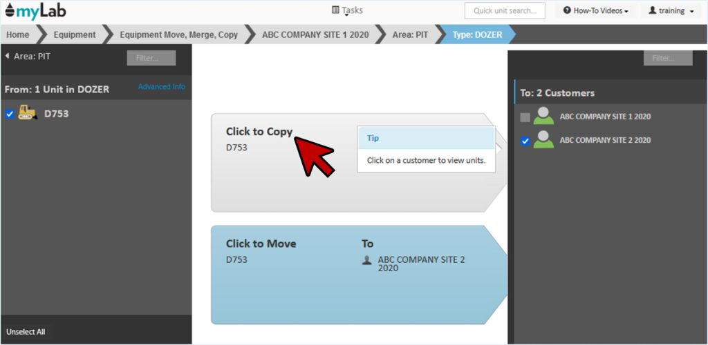 - From the Home Page, click on “Equipment” (A), then “Move/Copy/Merge” (B) in the left menu.