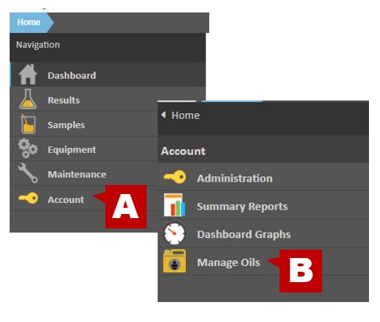 - First navigate to the “Manage Oils” section by first clicking “Account” (A), and “Manage Oils” (B)