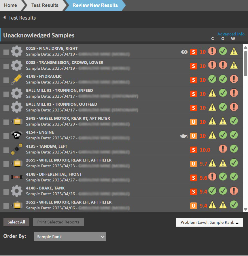 - On the Sample Review page, the page-wide Sample Rank bar has been removed and replaced with a more useful sample summary section. The left side indicates the Sample Rank number and the severity level of each Diagnostic (Contamination, Oil/Fluid Condition and Wear Indicators).