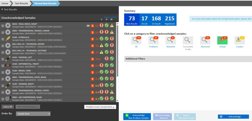 The Review New Results window offers users an at-a-glance overview of all the recent, unacknowledged samples with the ability to sort through all the samples based on the severity of the result.