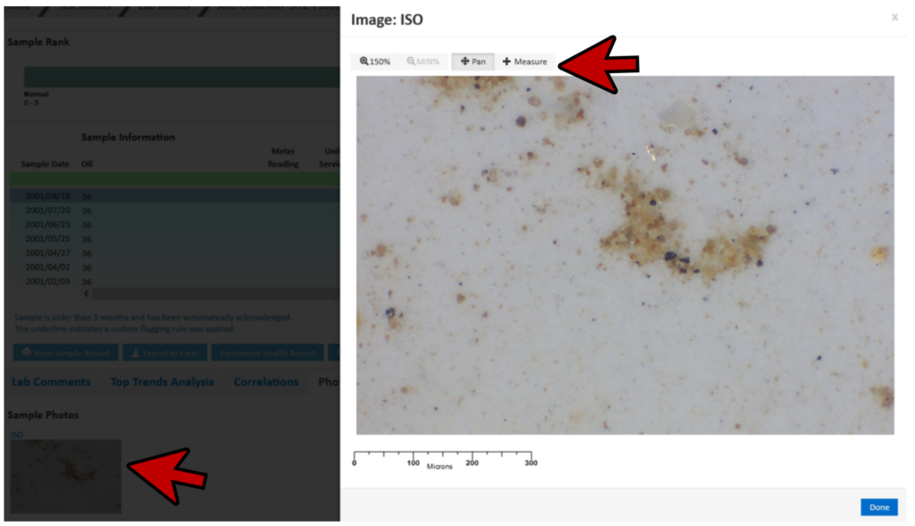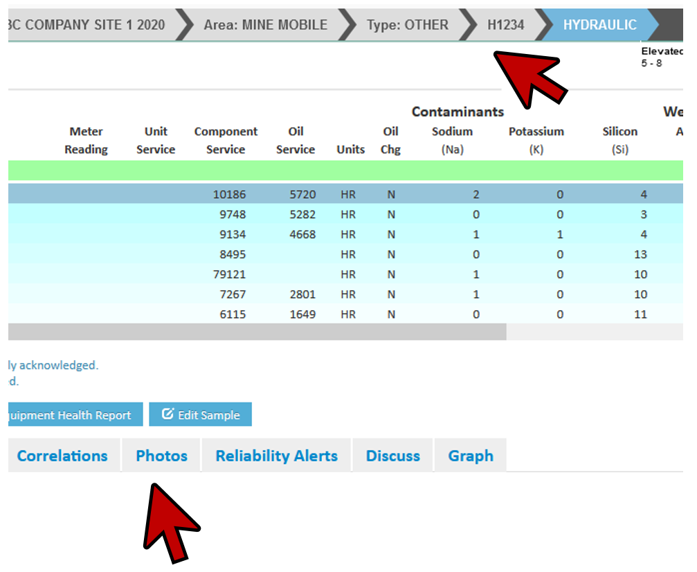 - CLICK the Photos tab. Sample results including pictures (ISO, Sediment or Ferrography) will be shown here.