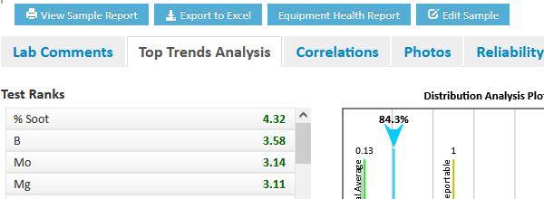 The Sample Rank is a combination of the top six Test Ranks. Individual Test Ranks are based on two primary factors: First is the percentile of the latest result compared to our histograms of similar samples. The second is how far off trend the current result is compared to previous results for the same piece of equipment. The factors are combined to compute the Test Rank such that the highest ranked test will be the farthest from typical average and most off trend. The Test Rank will be higher for a given percentile if the trend is increasing (assuming higher results are worse) and lower if the trend is downward.