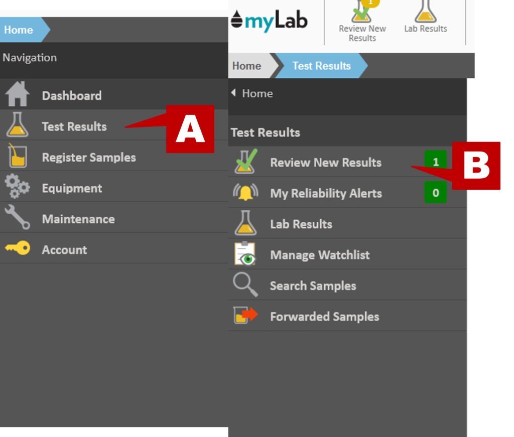 - CLICK Test Results (A) on the left navigation, then Review New Results (B) to open the Unacknowledged Samples window.