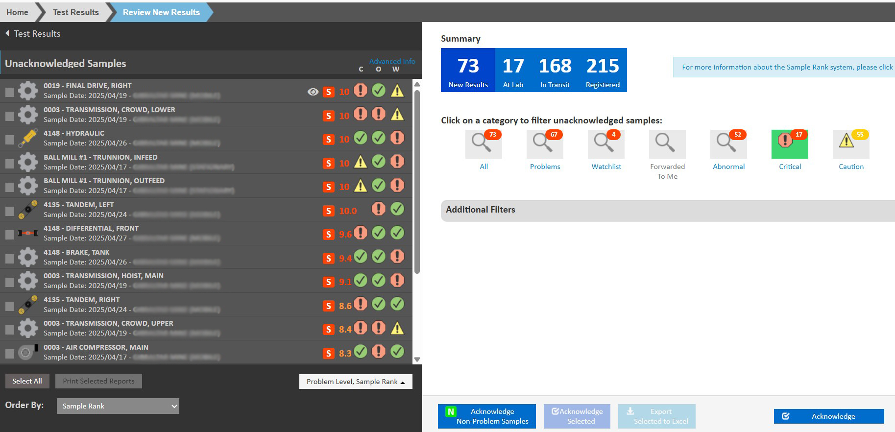 - A list of the most recent unacknowledged samples is shown in descending Sample Rank order.
