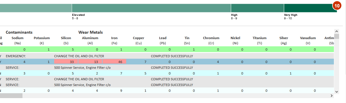 - Using the scroll bars, move up/down and left/right through the oil analysis data.