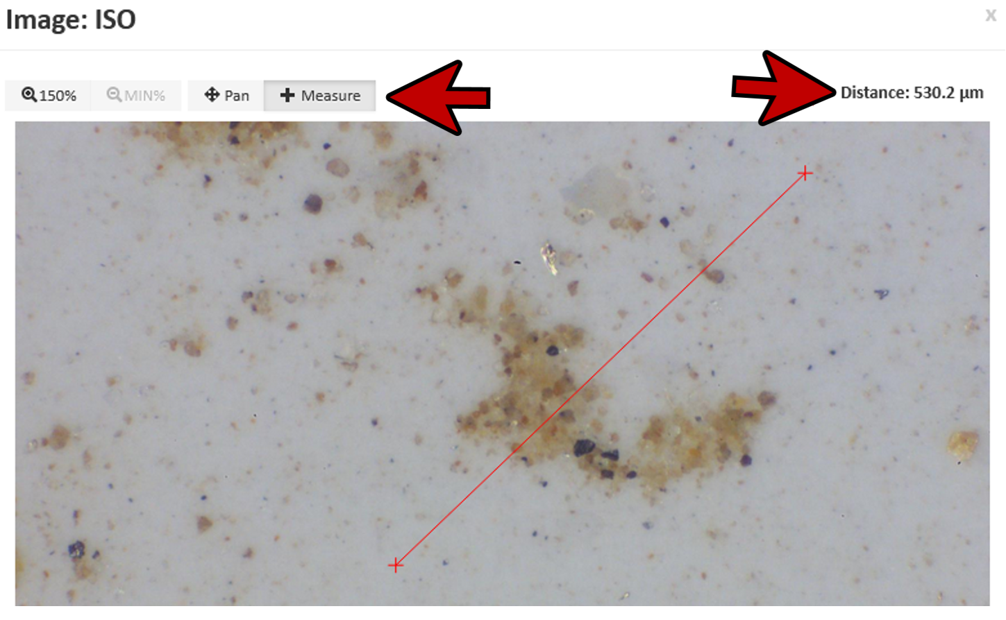 - In the photo CLICK, hold and drag. While dragging, the distance will be displayed in the top right-hand corner. This function is useful for determining the size of large particles.