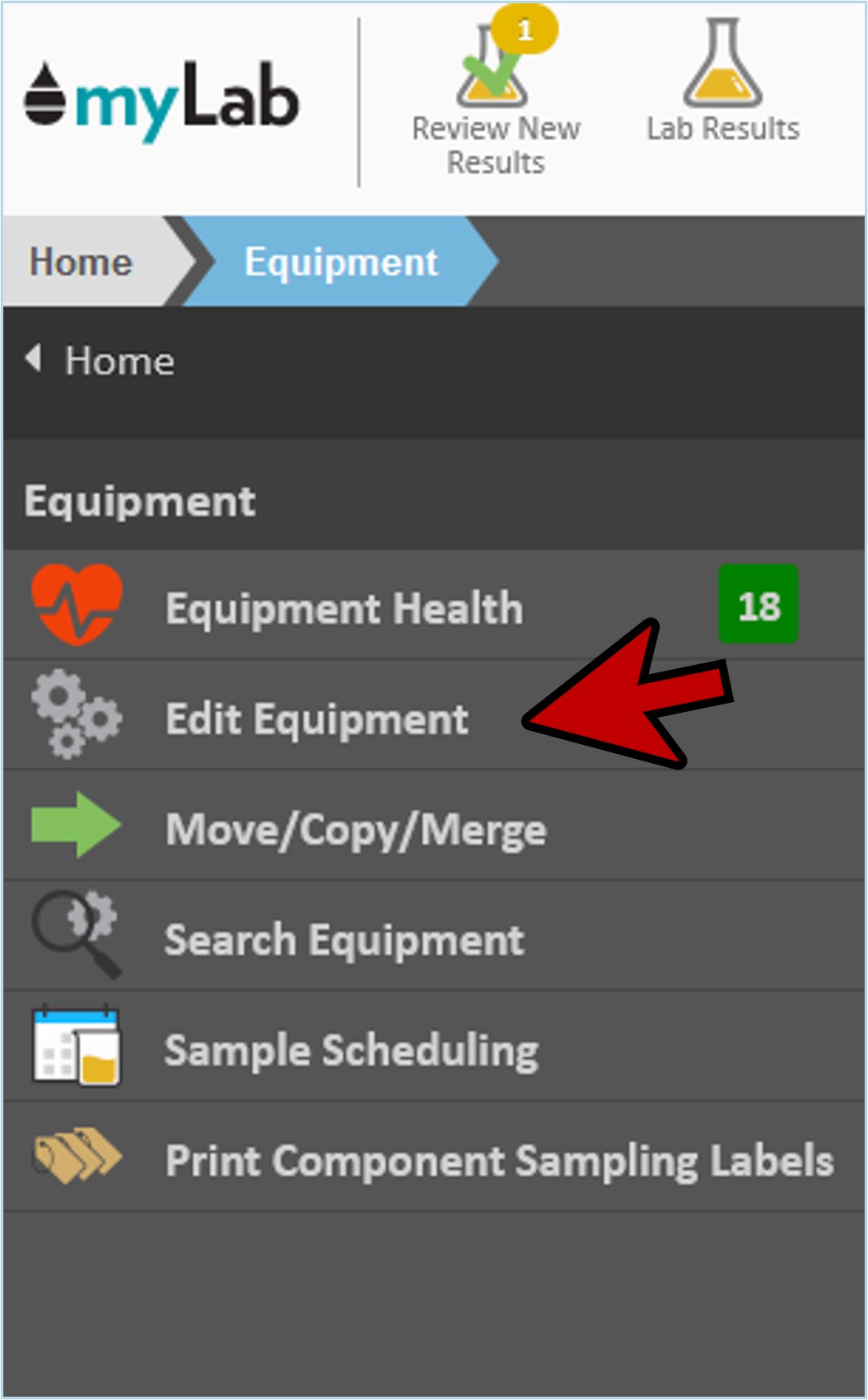 • From the myLab Home Page, click on “Equipment” in the left navigation. Select “Edit Equipment” from the next menu.
