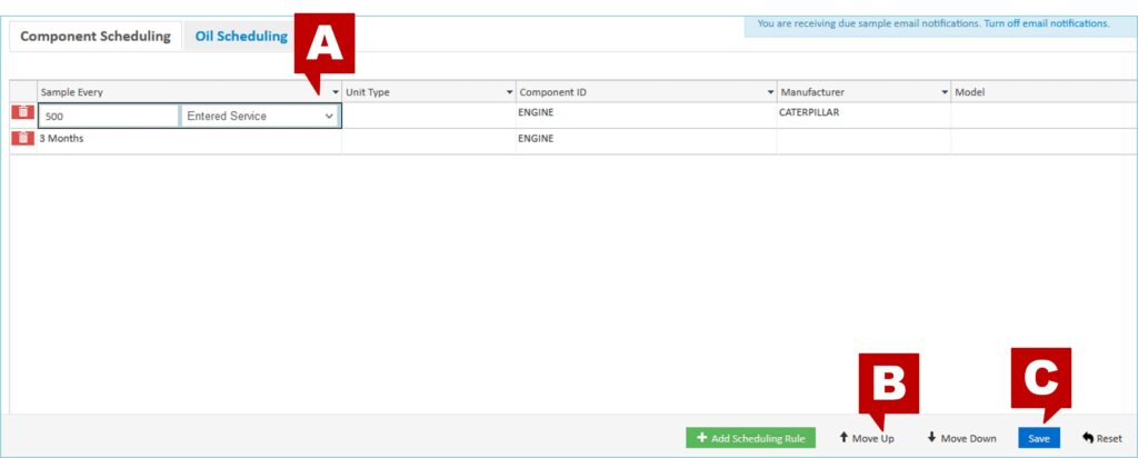 • For example, set the new rule for every 500 Entered Service (ex.hours) and then add Component ID ENGINE and Manufacturer CATERPILLAR (A).