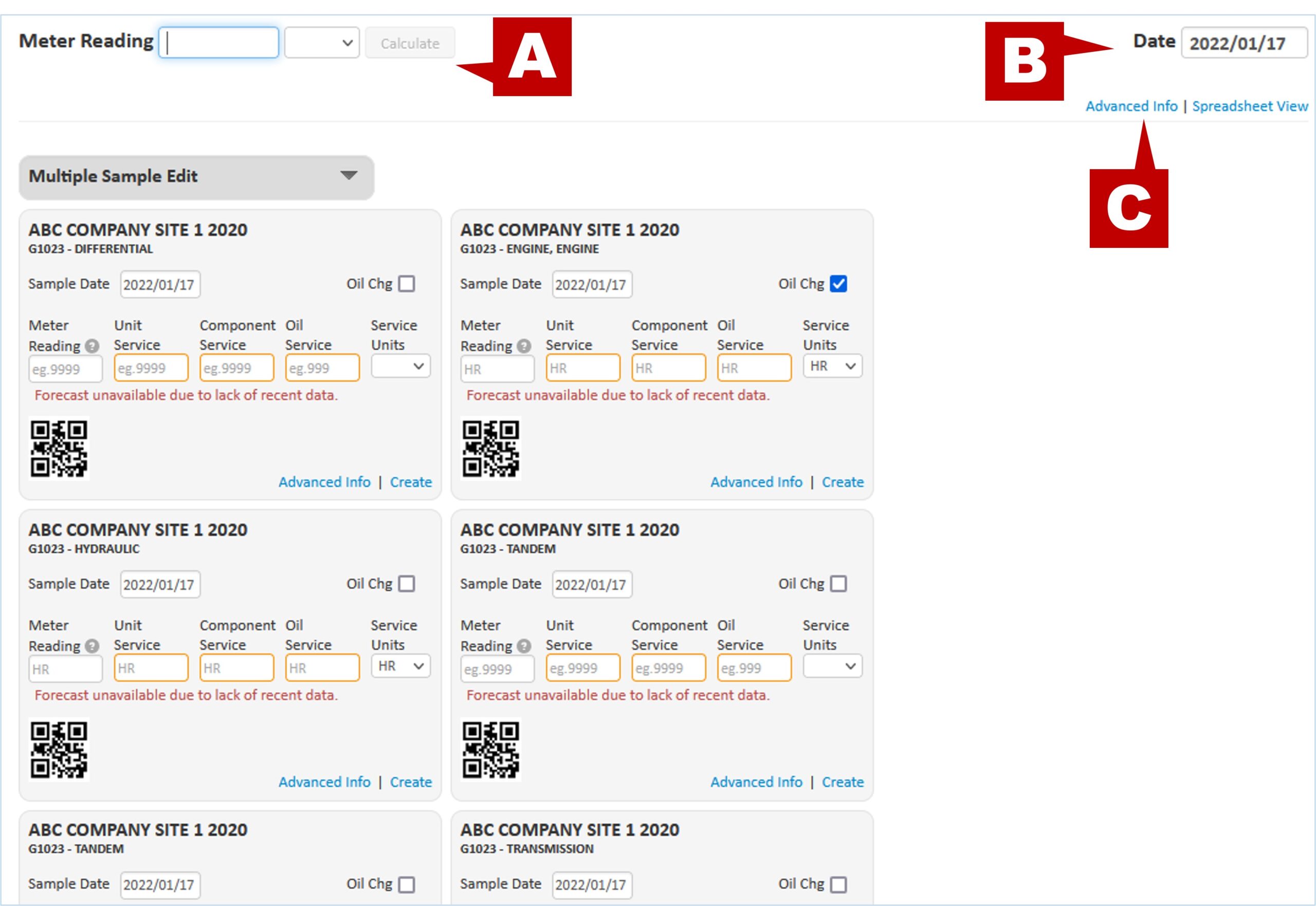 - On this page you can change the meter reading for all components (A), change the date to match the date the samples were taken (B), and switch to the advanced settings screen by clicking “Advanced Info” (C).