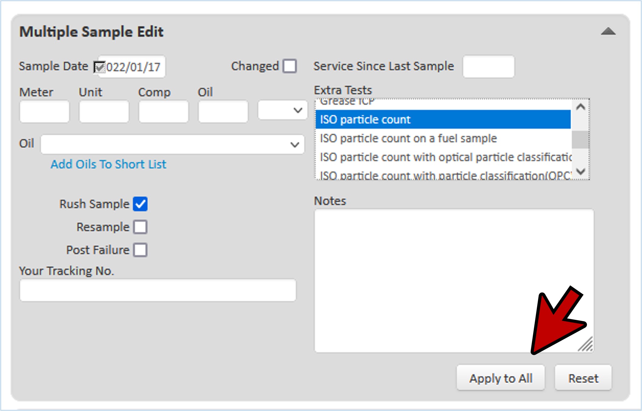 - This opens a section that allows you to make edits to all the key information including adding rush samples and extra tests. Once you have made all the required edits, click “Apply to All” to make the changes applicable to all samples in this batch.