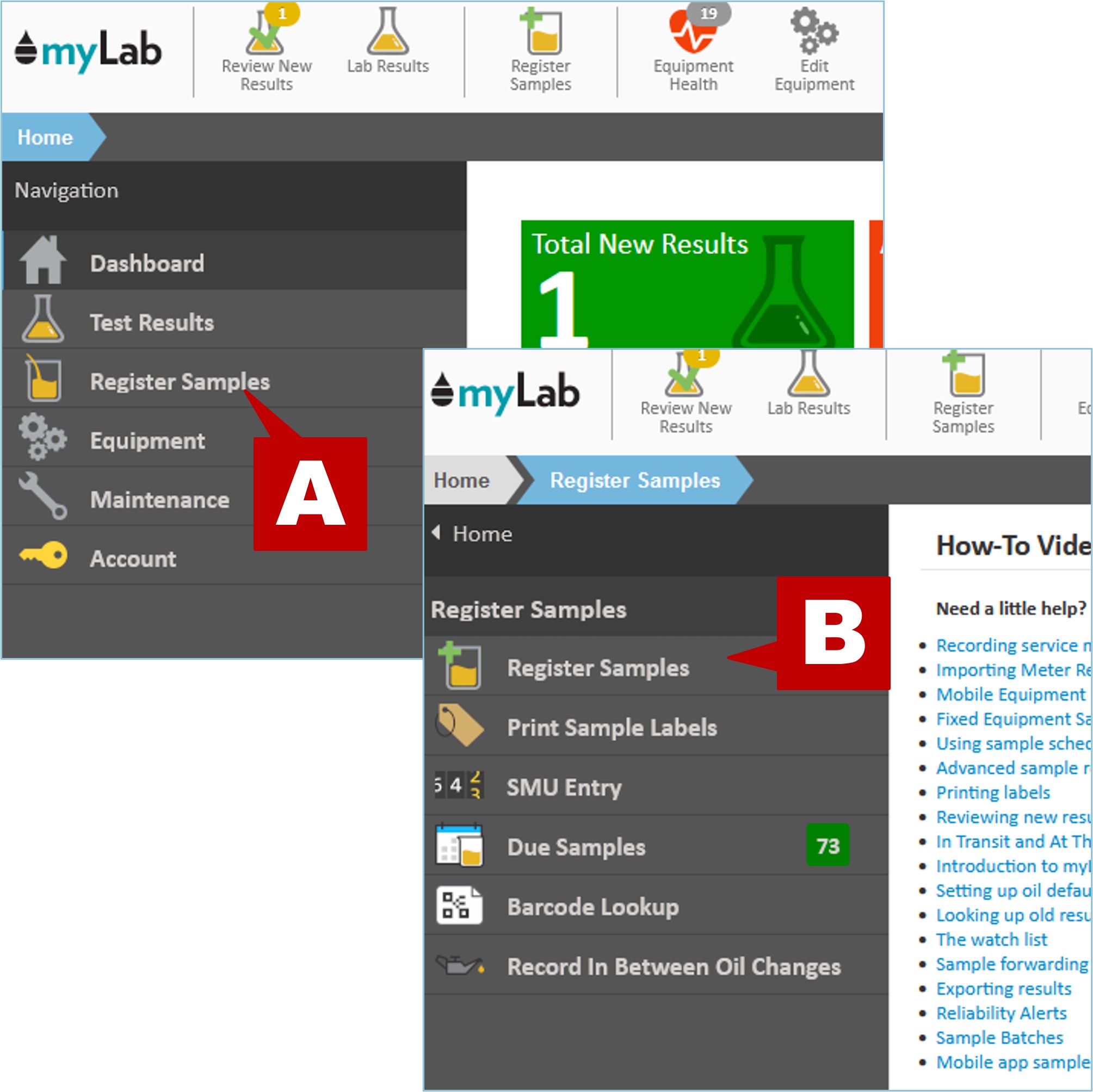 - On the home page, select “Register Samples” (A) and then “Register Samples” (B) once again in the left menu.