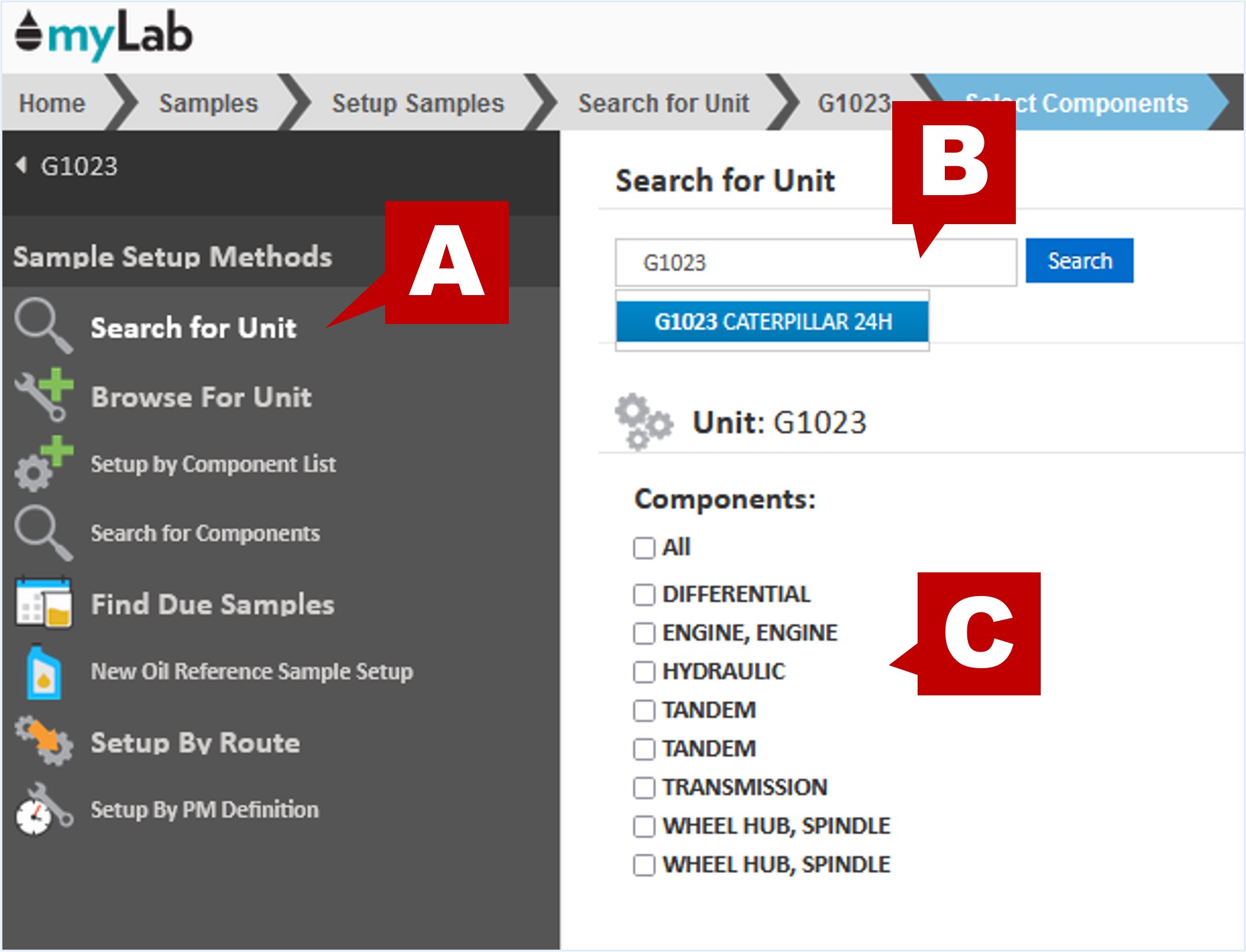 - A list of all of the components associated with that unit will then be shown under the Search box (C).