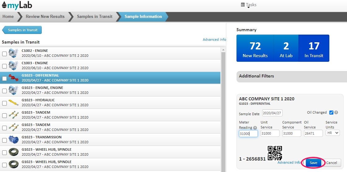 • This takes you to the “Samples in Lab” view. On the left you will see each sample, what equipment it came from and when it was sampled.