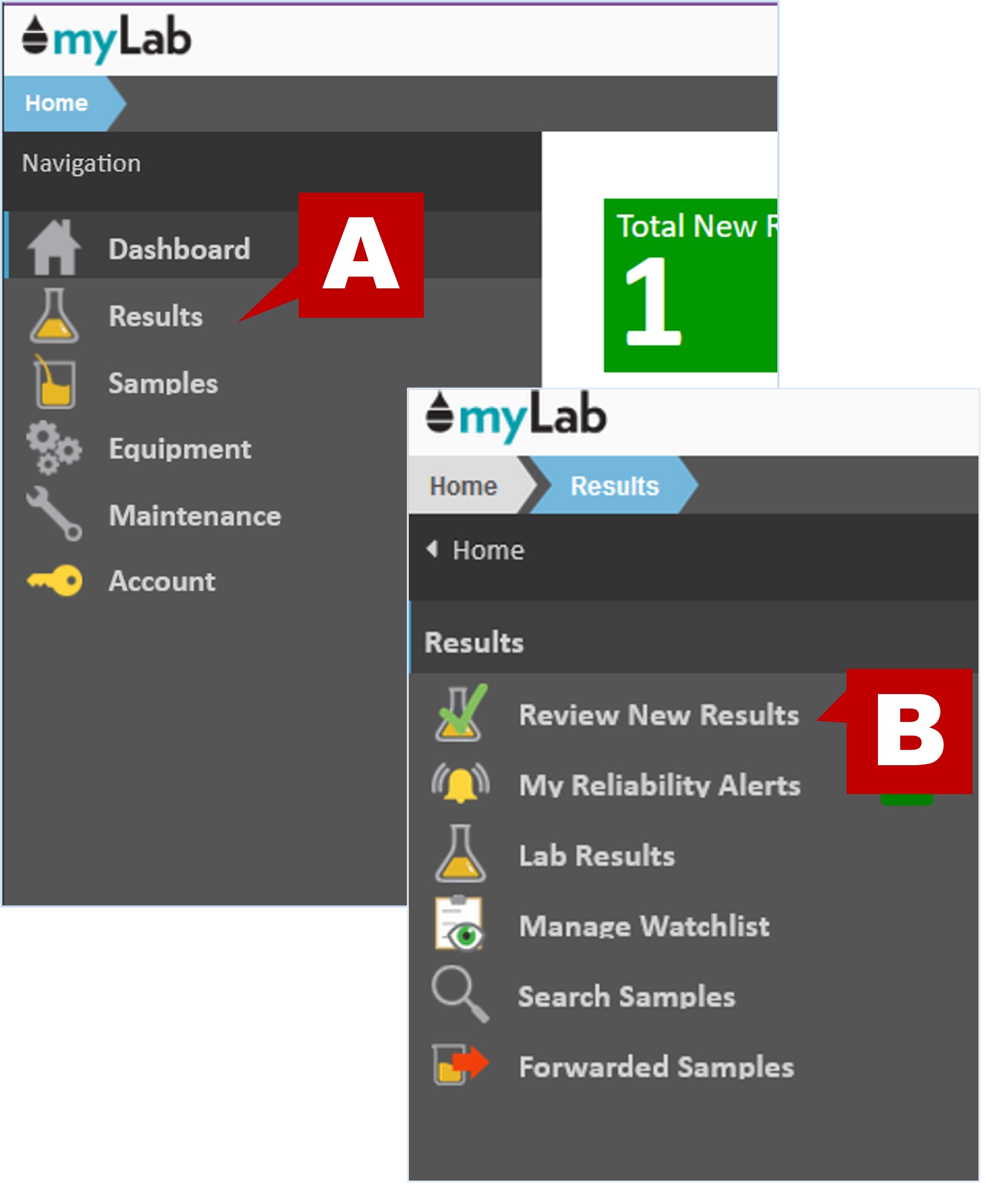 • Start by clicking on the “Test Results” (A) then “Review New Results” (B) on the left menu.