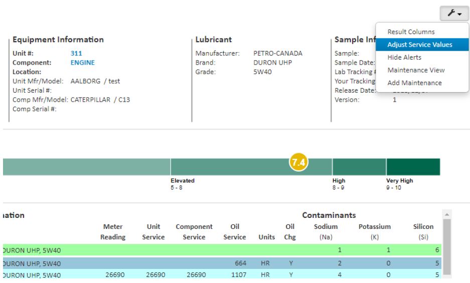 One of the most important parts of fluid analysis is viewing the trend of performance over time, and consistent service entries are a valuable part of this. In myLab, the Adjust Service Values feature, found in the menu on the top-right of the Sample Review page, allows you to utilize our available data-editing tools, including manual entry and column filling, to update missing service values on past samples.