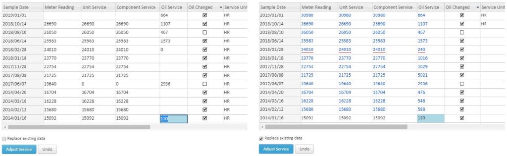 Toggled by a checkbox above the Adjust Service button, this option allows you to replace existing values with what is calculated. Leave this option disabled to preserve the original values. Enabling the ‘Replace existing data’ option allows the calculation to fill as many service readings as possible based on prior data, and will replace most existing service entries.