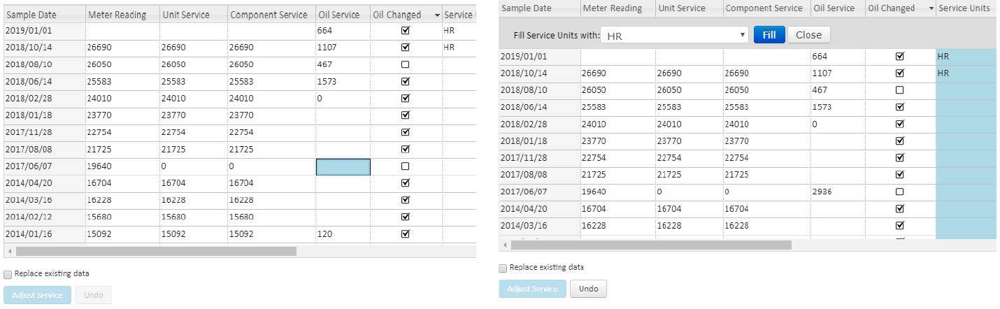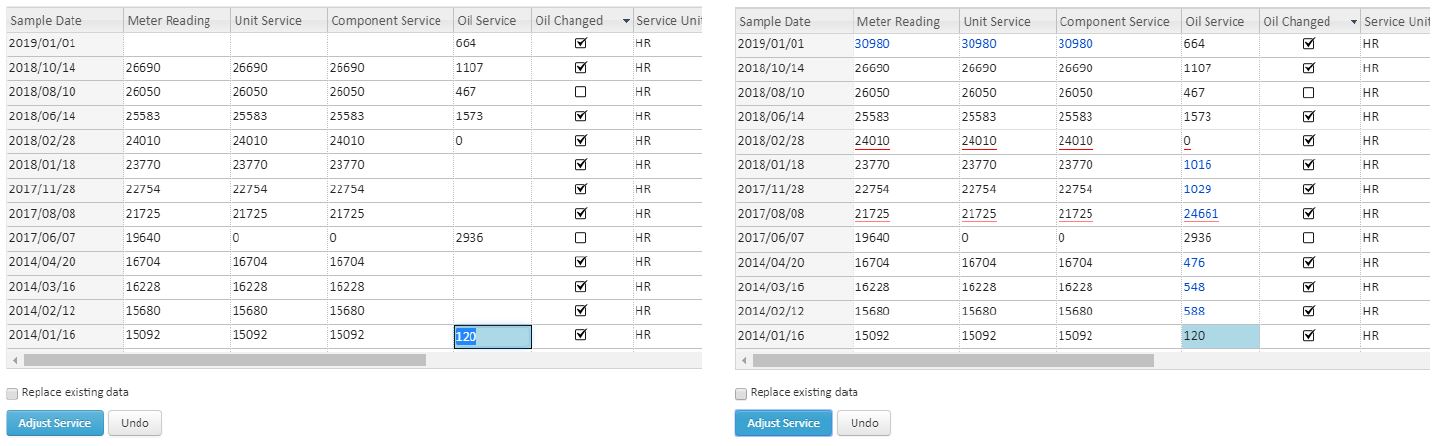 Toggled by a checkbox above the Adjust Service button, this option allows you to replace existing values with what is calculated. Leave this option disabled to preserve the original values. Enabling the ‘Replace existing data’ option allows the calculation to fill as many service readings as possible based on prior data, and will replace most existing service entries.