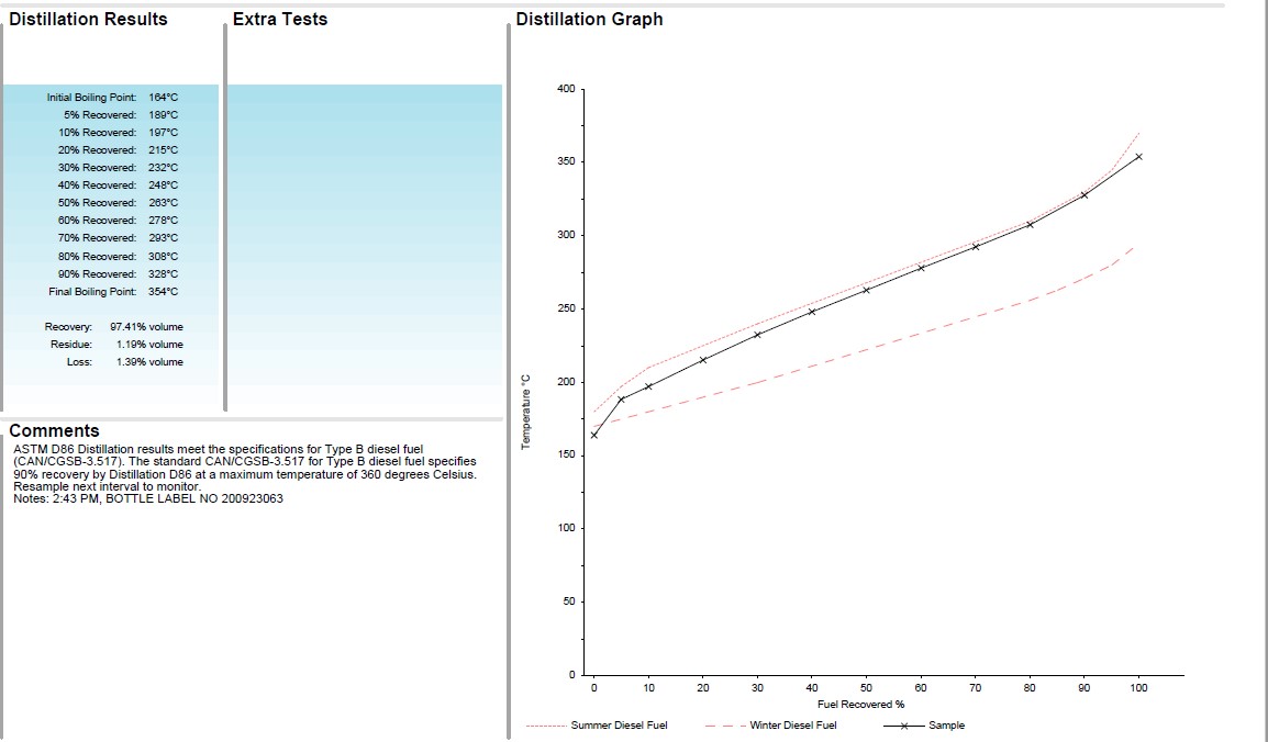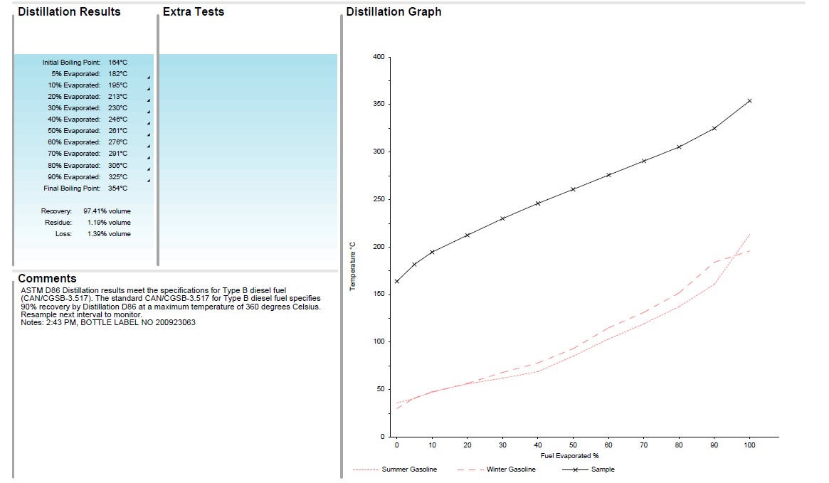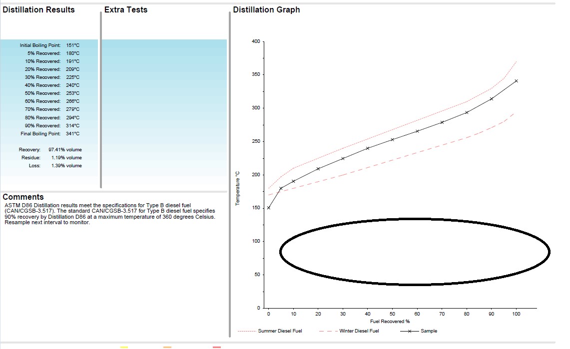 In the example below, the black line is the distillation curve of a diesel fuel sample and the two red lines are the Type A diesel (Winter Fuel, bottom) and Type B diesel (Summer Fuel, top) that are placed on a report as a comparison. In this case, the sample looks like a typical acceptable distillation curve for a diesel fuel meeting specifications for Type B Summer Diesel Fuel. Typically it’s somewhere in between the two. This test result can indicate if the correct fuel is used for the weather conditions and if a mix of the two has occurred.