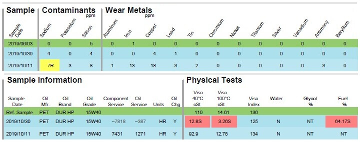 The engine oil was sampled 3 weeks after the initial oil change. The results indicated there were large amounts of diesel fuel present in the engine oil beyond what would normally occur from extended engine idling or typical unit injector leakage.